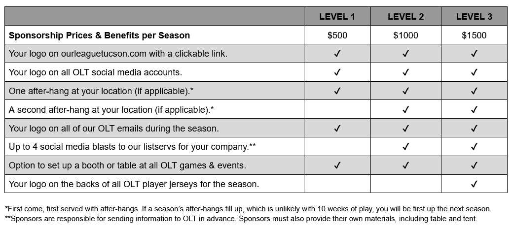 Please contact ourleaguetucson@gmail.com if you are interested in sponsoring us or fill out form below: